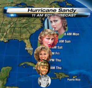 ‘Hurricane Sandy’ is moving slowly up the Eastern US coast line, causing havoc where ever she goes. Not only is she bringing millions of gallons of water and causing wind gusts from 50-90mph. On top of that, this femme fatale has a wider mid section of up to 500 miles, which effectively is the same size as California. This girl means business!!