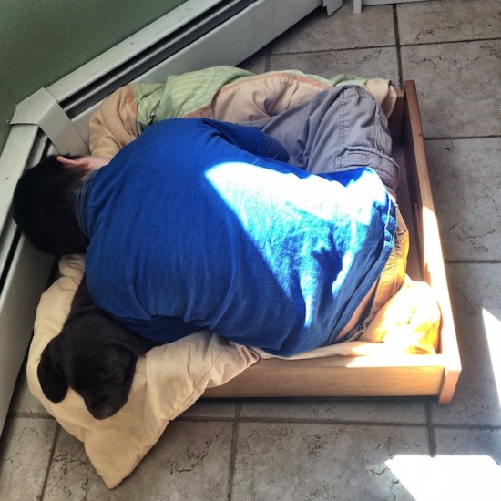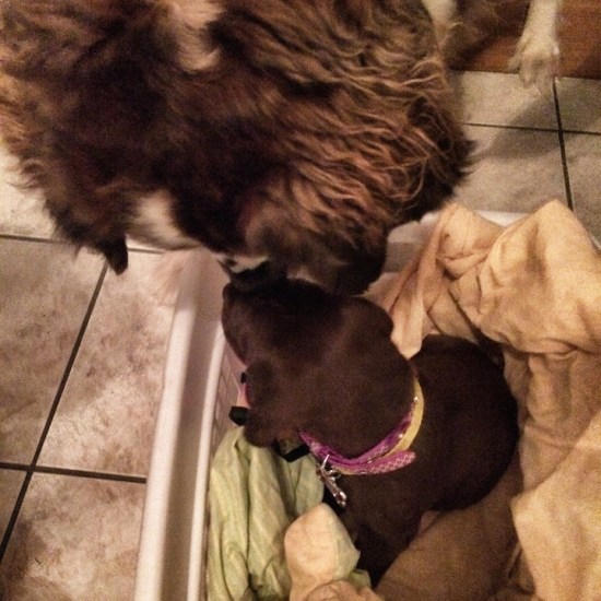 The 9-year-old St Bernard is shell-shocked with the arrival of this little chocolate-colored labrador, who chases her tale and bites her paws. She’s slightly apprehensive about letting the puppy cuddle up with her, and not too sure how to play with such a small thingy.