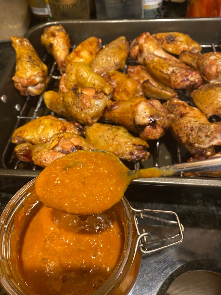 The wings are served without sauce at my place, as I want my guests to choose the sauce they like. There’s no point smothering them in spicy hot sauce if people do not like spicy shit.