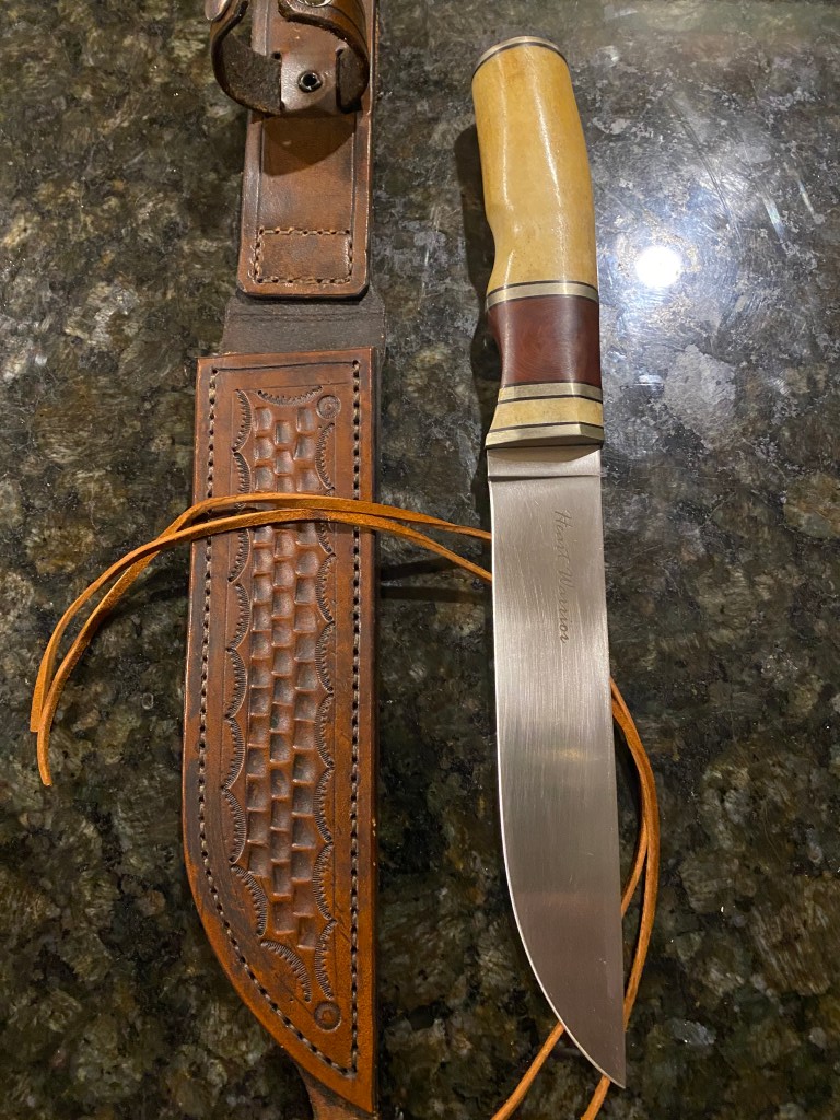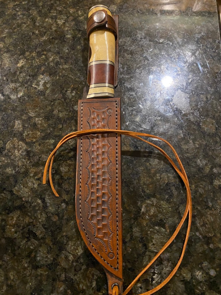 Listen, I have no idea how much time goes into making knives, but this is true craftsmanship. The knife was beautifully created with a smooth two-colored wooden handle, an 8inch blade, and a handmade leather sheath.