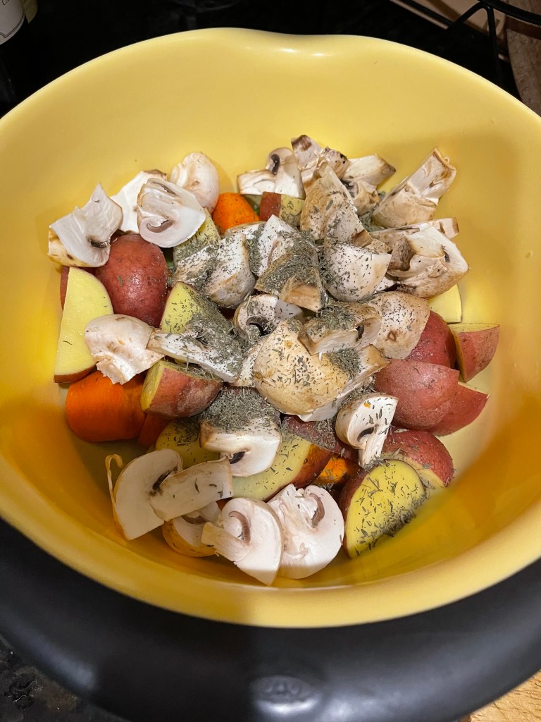 - Add the carrots, potatoes, thyme, and mushrooms while stirring gently.
