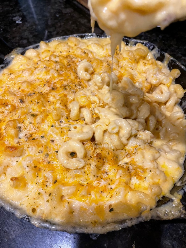 Please be careful. The skillet is super hot and so is the Mac ‘n Cheese. Do not grab it with your bare hands. That would be unwise!