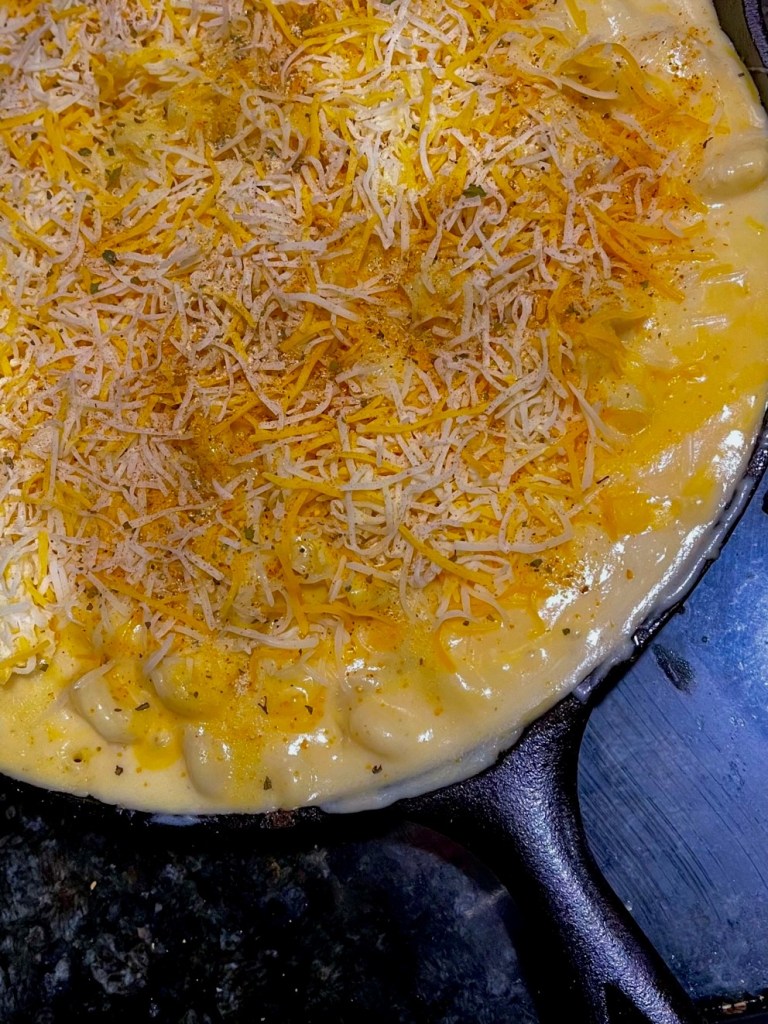 - Place the Mac ‘n cast-iron skillet back on the Traeger