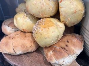 I learn new baking tricks weekly and try not to exceed my capabilities. So far, I’ve successfully baked ciabatta, flutes, carrot rolls, panini, tortilla, pita, heroes, morning buns, and my personal favorite, country loaf baked on the Traeger grill.