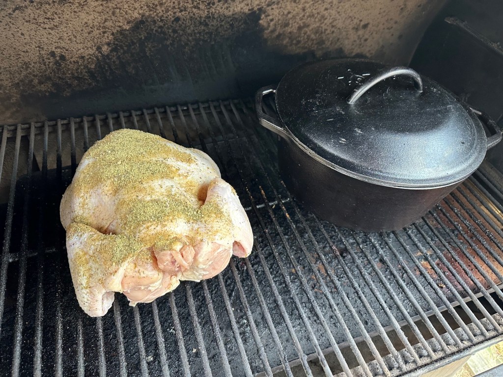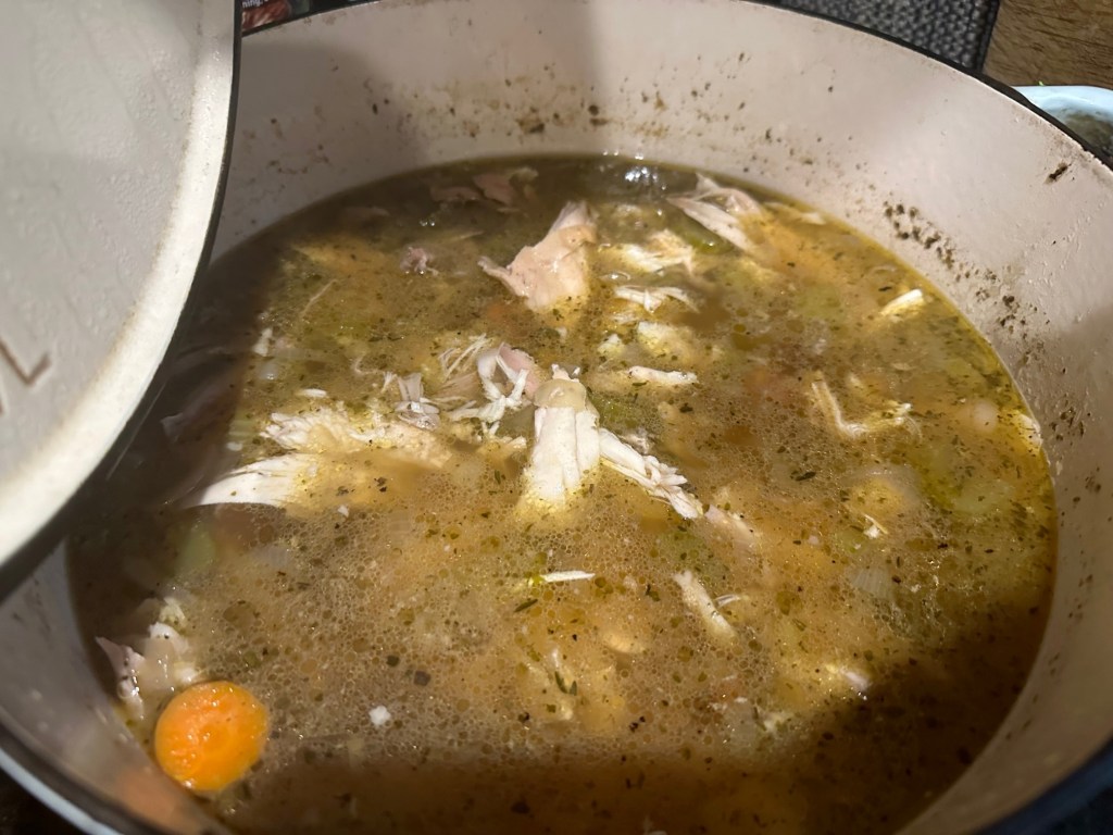 While smoking the pot roast, I threw in a whole chicken on the grill for an hour to be added to my chicken soup. Again, we need energy and immune-boosting food, and chicken soup is good for the heart. Then I removed the skin and quartered the chicken before adding it to the stock and vegetables to simmer for an hour – or until the meat would fall off the bones.