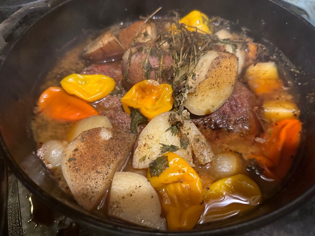 After 5 hours of slow-cooking in the Lodge cast iron Dutch oven, on the Traeger, I served a pull-apart roast with roasted potatoes and gravy made from the juices. Damn delicious and full of energy.