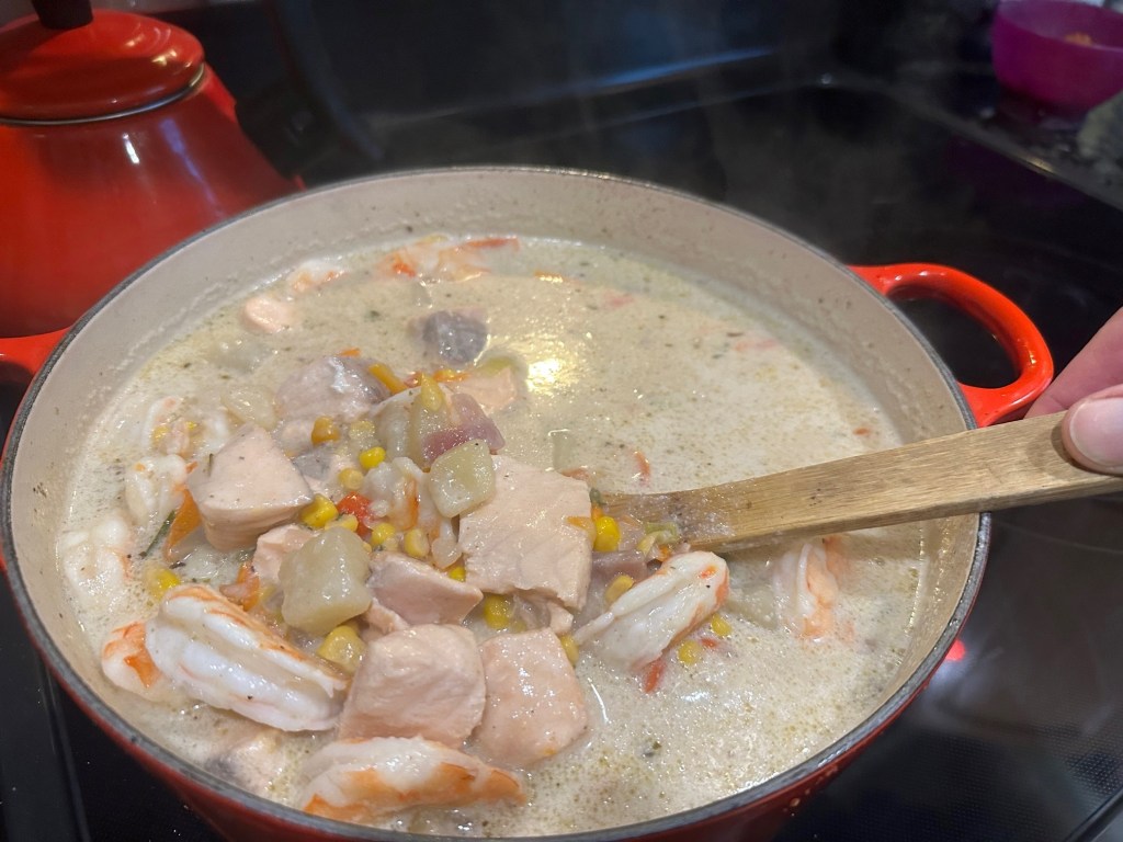 In parallel, I updated a salmon chowder recipe I had used, made a new version, and called it the Svendborg Sund Seafood Chowder. It is an excellent combination of fresh vegetables, large shrimp, potatoes, salmon chunks, and coconut cream instead of heavy cream. Excellent and smooth chowder.