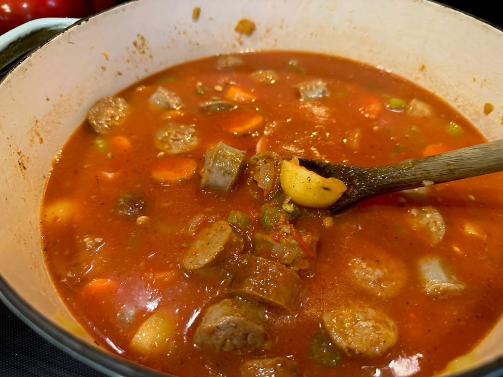 We start the week with my famous lentil sausage stew. It is bloody easy to cook and eat like a Viking, as long as you have a few simple ingredients and a Dutch oven. It would be best if you had your stew trilogy (celery, carrots, and onion), some spicy sausages, a few spuds, chicken broth, a large can of tomato, and lentils.