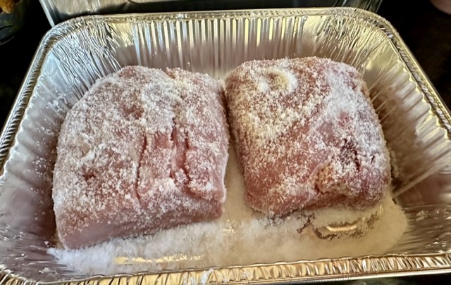 After defrosting the meat overnight, I generously rubbed and covered the meat with salt. According to the recipe, the meat must sit in salt for 24 hours, and you should change the salt halfway through.