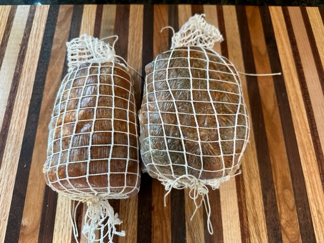 Once the meat was spiced up, I wrapped it in collagen paper and stuffed it into the meat netting, tied both ends and then they are ready to hang for a couple of weeks. Apparently, they have to lose 30% of the weight in the process.