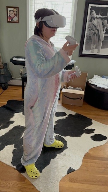 Because it was Easter break, she stayed in her pajamas all day, while building new Lego pieces, eating croissants, and playing with VR through the Oculus headset. Playing with Oculus is a bizarre spectator game too, as your child is walking around the room while making interesting hand gestures, and talking to either herself or other players.