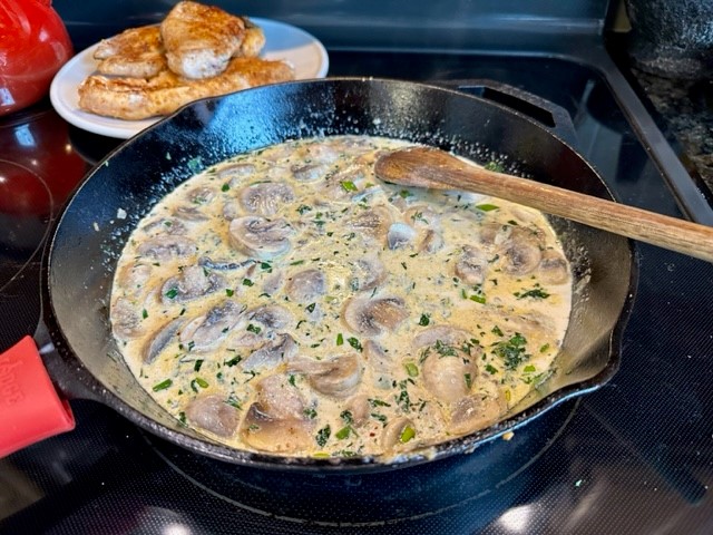Midweek we will enjoy creamy chicken and mushroom cooked in the Lodge Castiron 12″ skillet, and served with mashed potatoes. Cooking with cast iron gear is very nice but you cannot store food in the skillet as you can with other pots and pans.