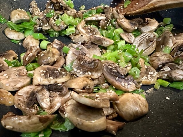 While the Chicken Ruby tomato sauce was simmering, I made the mixture for the Asian Salmon noodle dish. Greem onions, mushrooms, mixed vegetables, and a nice sauce made from honey, chili oil, and coco aminos. We use coco aminos as a substitute for Soy sauce.