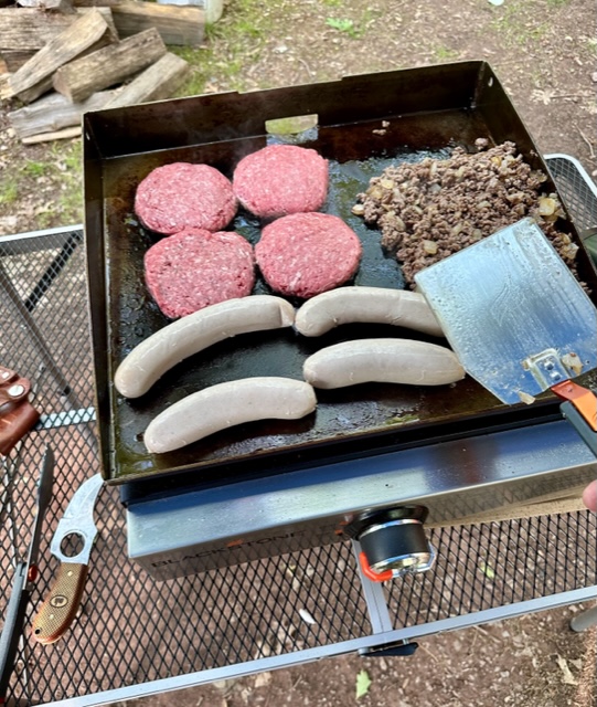 When camping, we have two choices for preparing food. 1. use the firepit and a grill, or 2. heat the trusty Blackstone griddle. Sometimes we use both, depending on the mood.