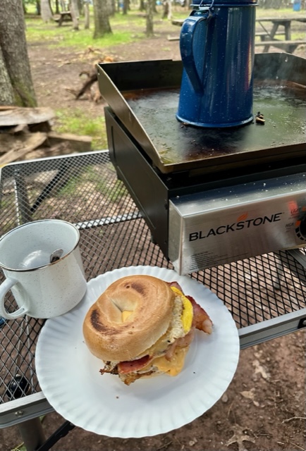 For breakfast, I made some mandatory bacon, egg, and cheese bagels and discovered that heating water on the griddle is not quick or efficient. We brought instant coffee, but getting the water hot enough on the griddle took a long time. When I had eaten my bagel, the water was getting lukewarm.