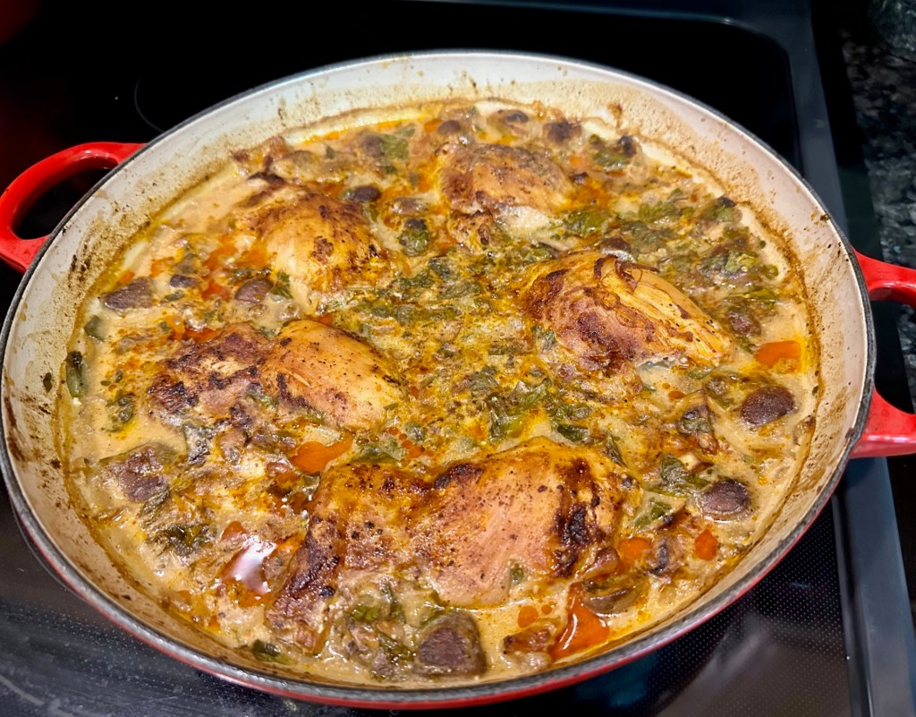 Afterward, I made a quick creamy chicken and mushroom in my Le Creuset skillet in the spirit of Chicken dinners. You braise the chicken thighs for 5 minutes on each side, then you fry the onions and mushrooms and add a little sherry for the sauce. You sprinkle some flour in the pan for the sauce and add chicken stock and sour cream. It becomes a nice sauce, and you place the braised chicken back in the pan and bake for 45 minutes.