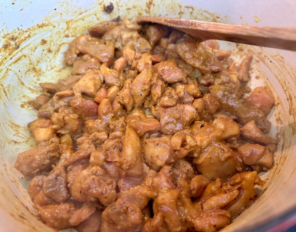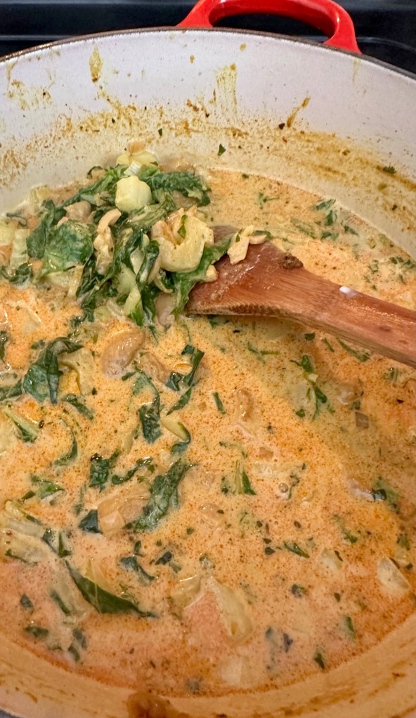I started Sunday morning by dicing and frying chicken thighs spiced with Turmeric, pepper, and garlic, and then I added onions, Bok Choy, red curry paste, and a few cups of coconut milk. Once it was ready, I sprinkled a few torn Thai basil leaves into the dish. I’ll cook the noodles on the day we eat.