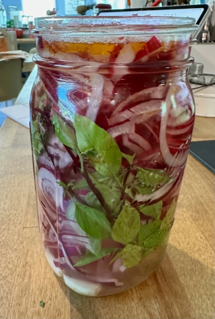 We love fish and somewhat spicy flavors, so I made a simple tilapia and spicy sausage mixture, threw in some fresh-cut cilantro, and made a cool fish taco. I prepared pickled jalapenos, pickled red onions, and homemade salsa as condiments. We can still eat nice stuff even when food is fast and simple.