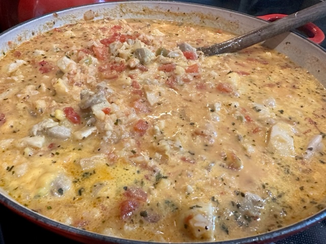 As you know, we love chicken, particularly chicken thighs. So, I cut up a few thighs, fried them in the pan, add some fresh produce such as garlic, green peppers, and celery. Then I added cauliflower rice, chicken stock, half-half, and a bunch of cilantro. For the last 5 minutes, I sprinkled some storebought queso.