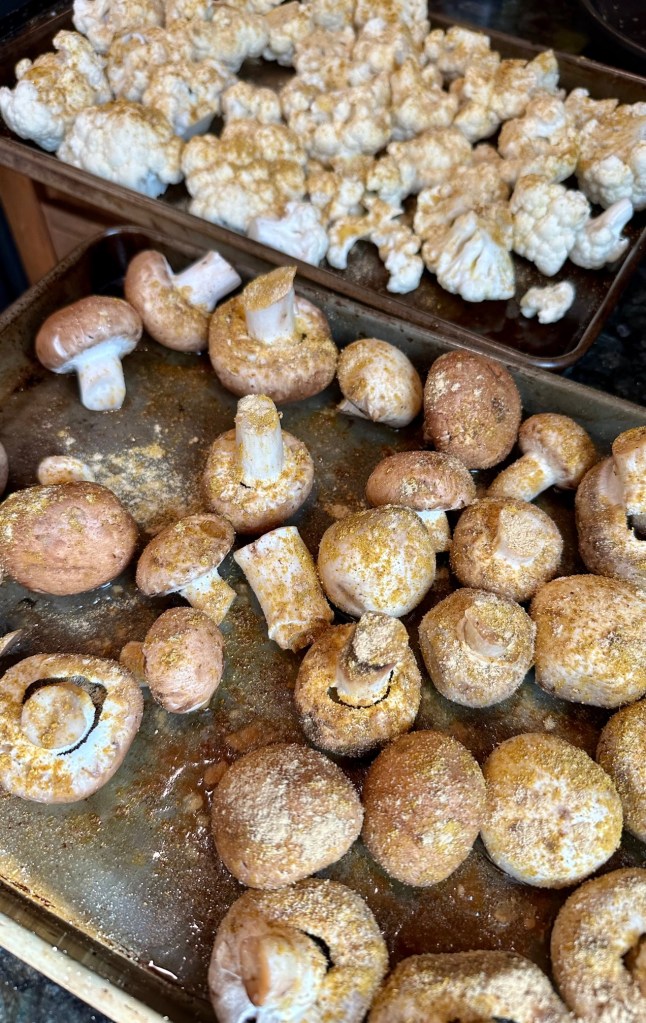 So, I made a roasted mushroom and cauliflower soup using the leftover vegetables and used the spinach and kale for the pineapple chicken as a side dish.