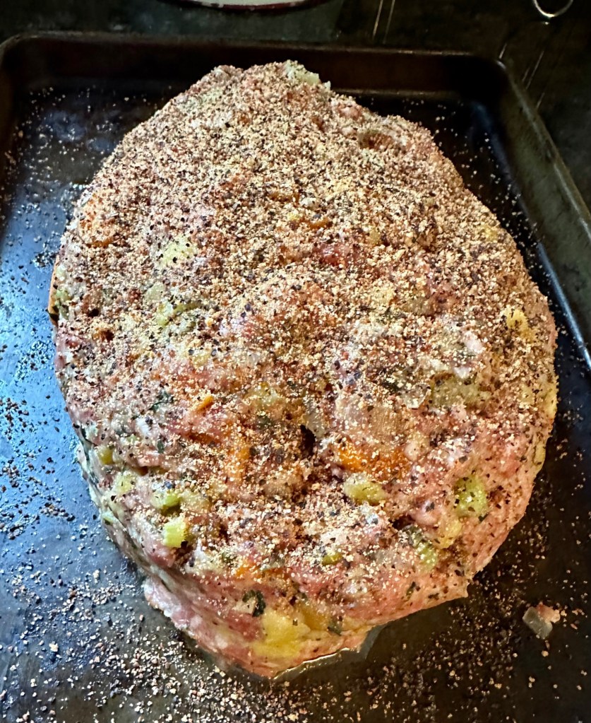 I’m slowly frying some vegetables and throwing some bread slices chopped into fine pieces for dinner. I mix it with the meatloaf mixture (pork and beef ground), then grill if for 45 minutes on the Traeger. The aroma is fantastic when you take it off the grill and let it cool.