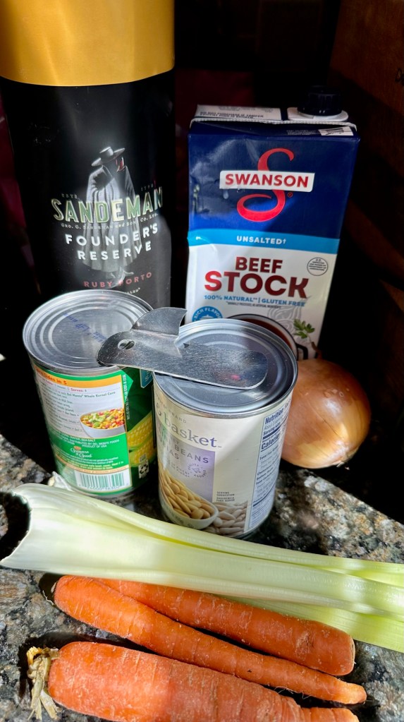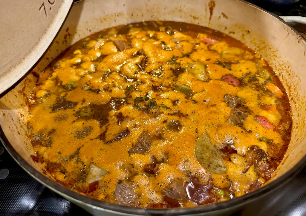 While the meatloaf is roasting, I gently cover the brisket in BBQ rub (Meat Church) and let it roast alongside the meatloaf. Once done, I chop it into 1-inch squares and continue making what resembles a stew, although it is called Brisket Soup.