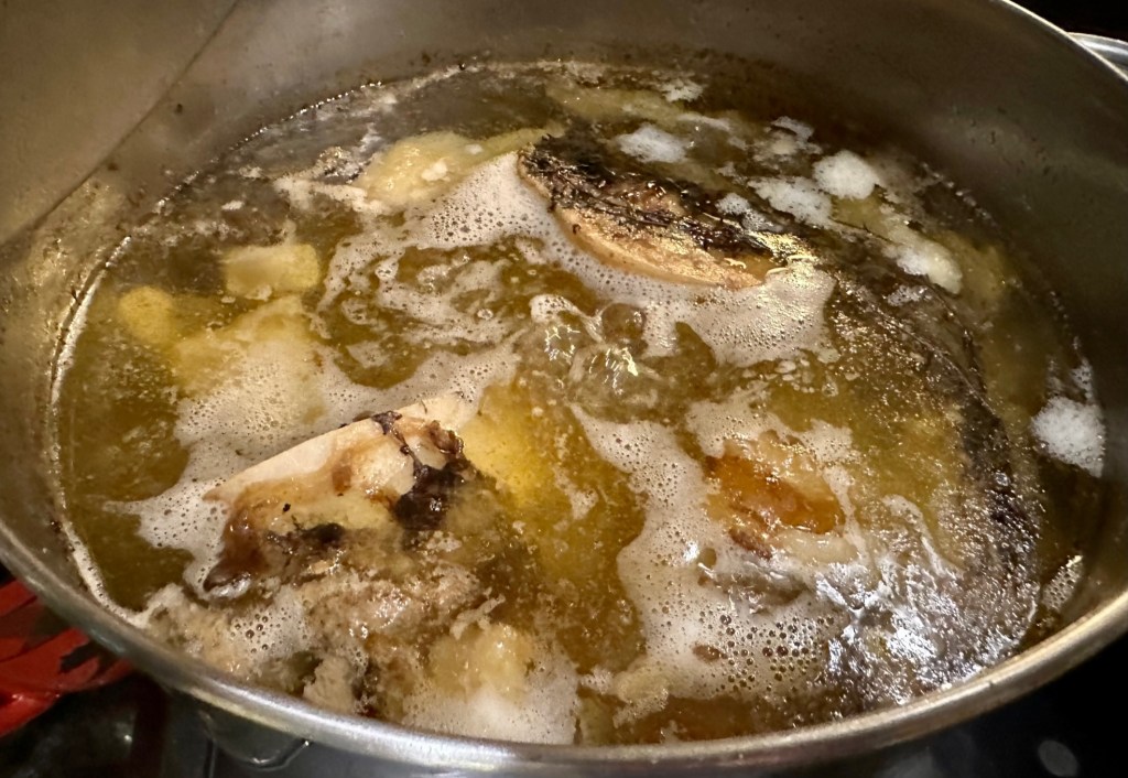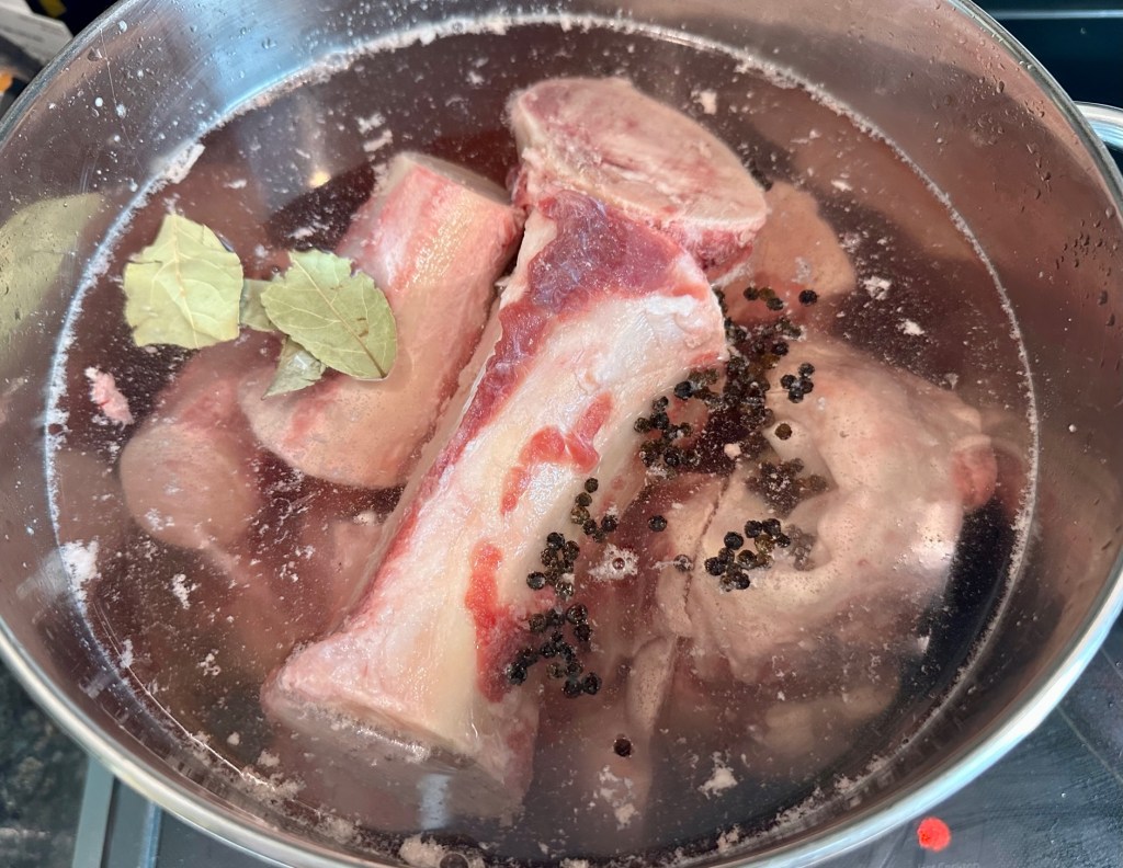 In parallel, I fill a large stock pot with water, throw in some ginger, bay leaves, and peppercorns, and gently fill it with bones. It is time to cook bones stock. The bones will simmer for two days, and I top up the pot to always keep the bones covered. Stock is packed with so much flavor and healthy stuff to boost your immune system. We use bone stock for cooking soups and warm teas.
