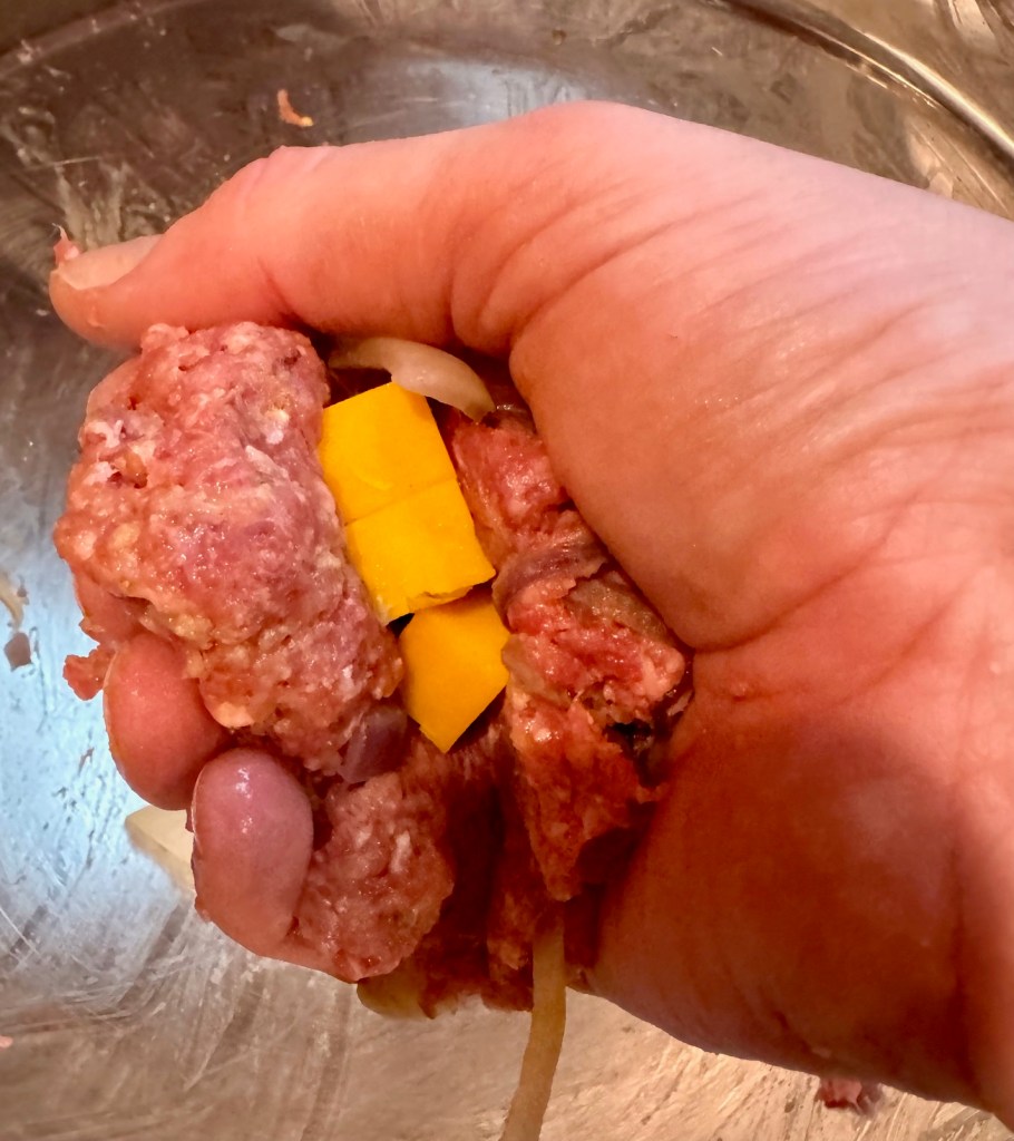 While I smoked the vegetables, I started the Mountain-styled cowboy meatballs. No, not Rocky Mountain Oysters, just regular meatballs stuffed with onions, herbs, and cheese. I make the sweet and spicy sauce while the meatballs roast in the oven.