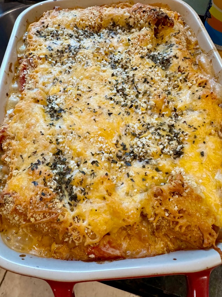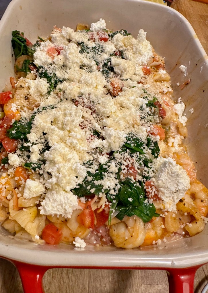 For the lasagna, I got a lot of frozen shrimp (small and large) and some imitation crabmeat. I wilted a large amount of spinach with onions, made some bechamel sauce, and mixed in a can of unsalted chopped tomatoes. Then, I layered the lasagna and baked it for 45 minutes.