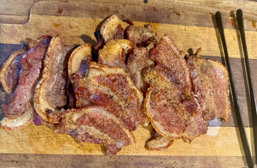 We move swiftly onto a pork loin pot with mushrooms and onions and then a paprika and cream sauce – served with boiled rice. But I do add fried and crisp bacon to the stew, too.