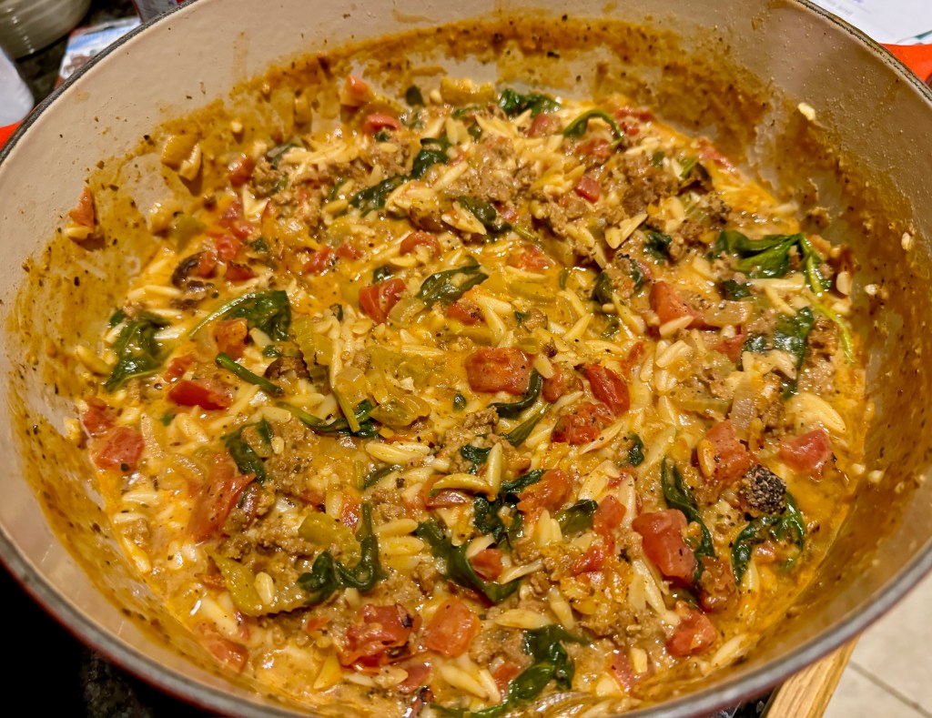 Last but not least, I prepared a simple sausage (chorizo) and orzo “soup” and added some baby spinach and a few quartered mushrooms.
