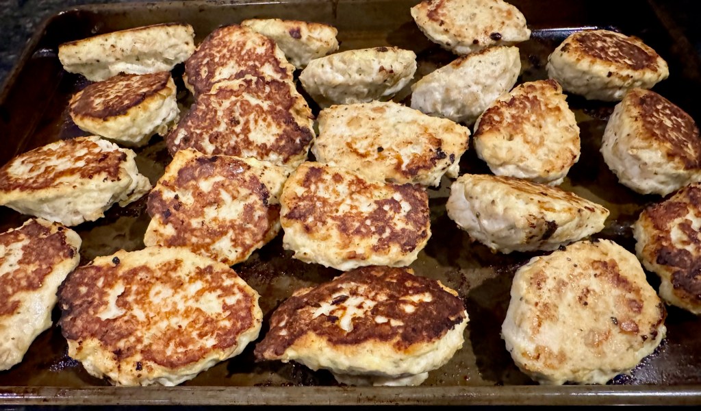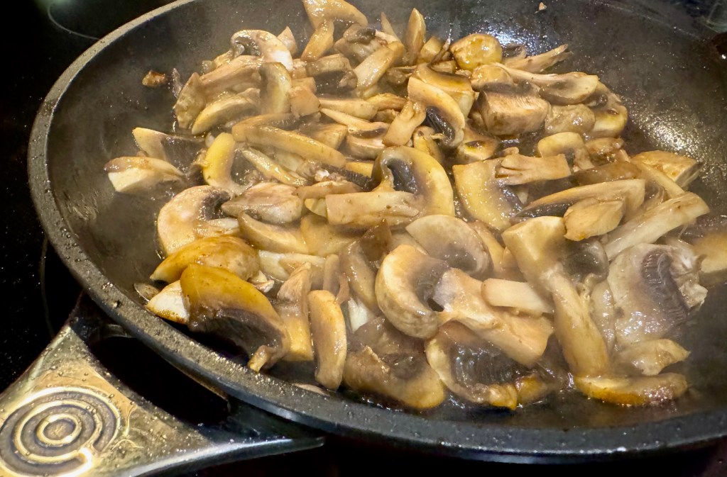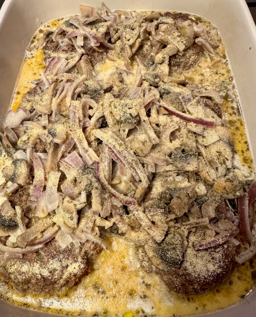 I made some nice thick beef patties with celery and paprika mixed in, fry them on the pan (5 minutes per side), place them in a large oven tray, and then pour over a mushroom and onion cream sauce – then I bake the entire dish for 20 minutes.