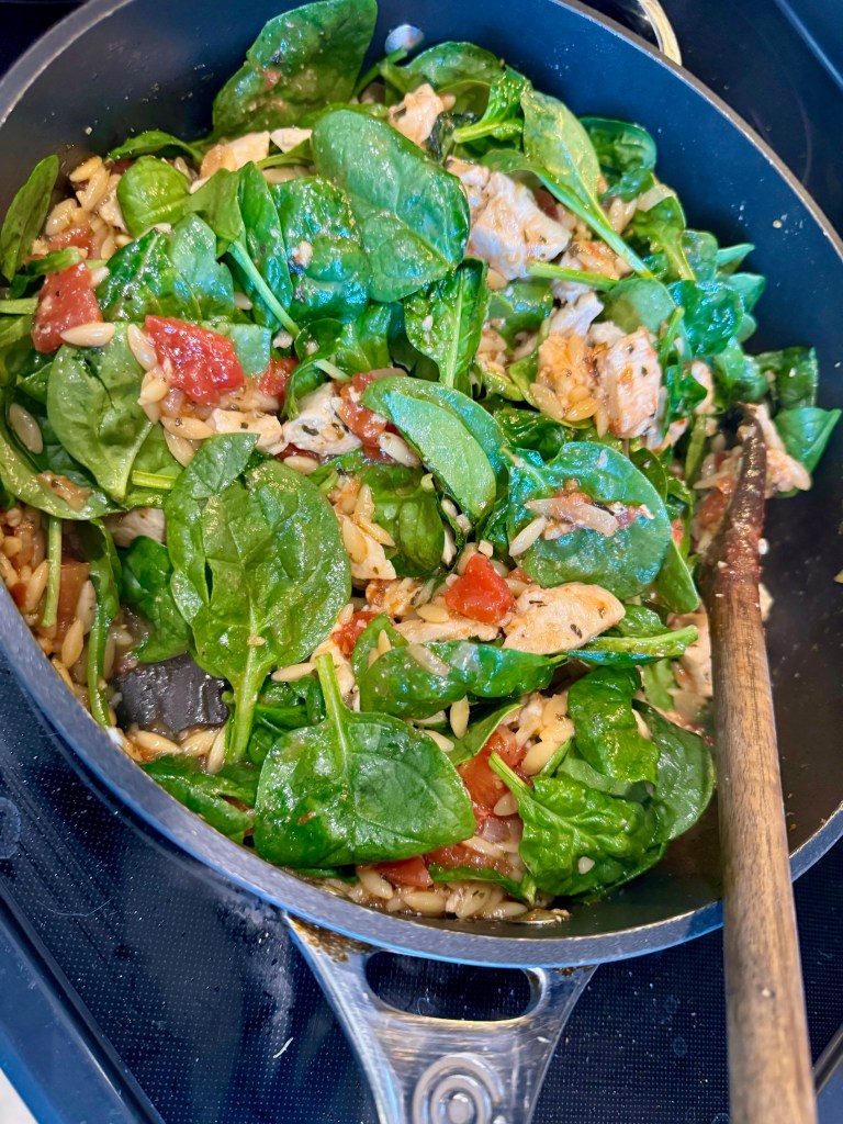Later in the week, we will enjoy a quick one-pan chicken and orzo dish served with spinach and tomatoes. Yes, more pasta!