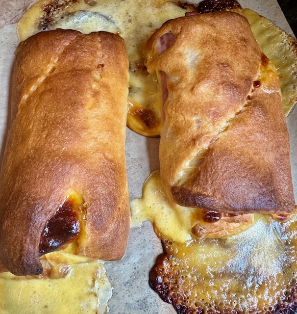 Then, I’m making Mufaletta, a premade dough rolled with salami, ham, and cheese. I sprinkled some spices and baked it for 10-15 minutes.