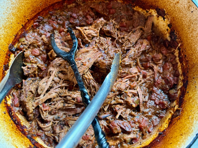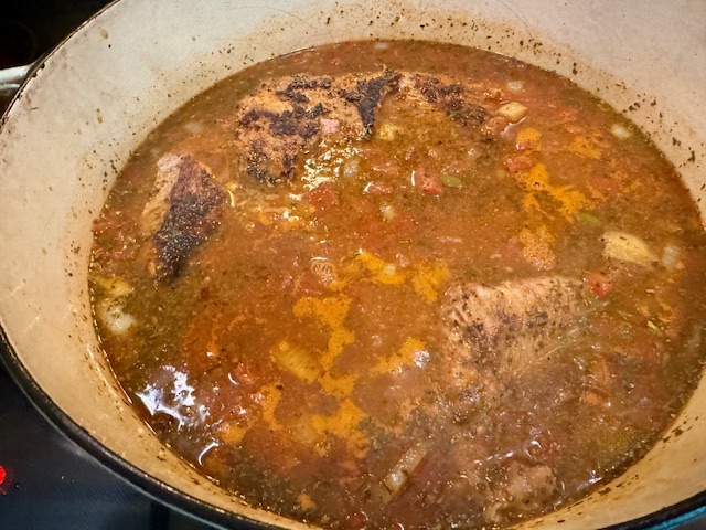 Because of the time it takes, I started with the brisket. I removed excessive fat, added spices, and browned the sides in my Dutch oven. Then I prepared the sauce, added the brisket, and baked/smoked it on the Traeger for three hours.