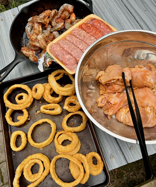 Dinner is a mix of chicken, beef, and kielbasa. I made dinner using the Traeger, a deep fryer, and the stove.