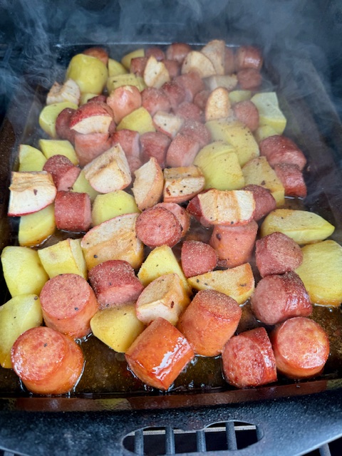 In parallel, I prepared the kielbasa tray with potatoes and apples and placed it on the Traeger.