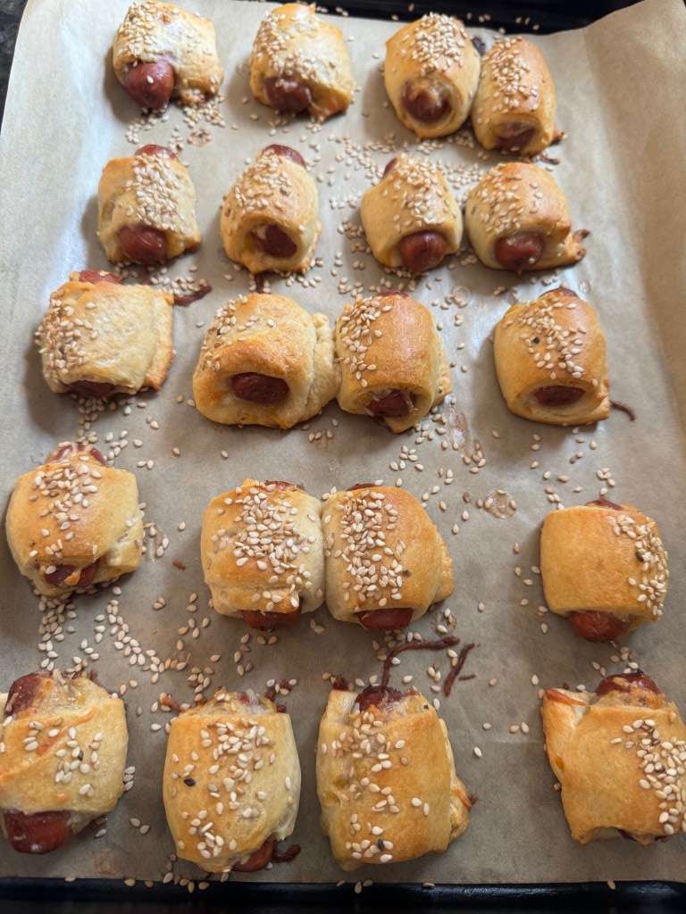- I made a fresh batch of pigs in blankets using croissant dough and frozen (defrosted) cocktail sausages.