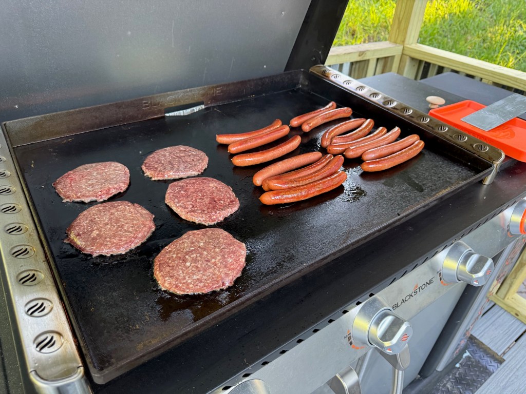 I spent a lot of time preparing and setting up the new outdoor kitchen and seasoning the Blackstone Griddle, which can take 30-40 minutes if you give it four coats of seasoning. In short, you heat the griddle, add vegetable oil or Blackstone seasoning grease, and rub it all over it. It will create a lot of smoke, and the griddle will change color.