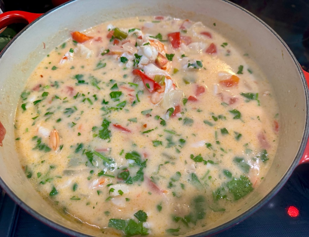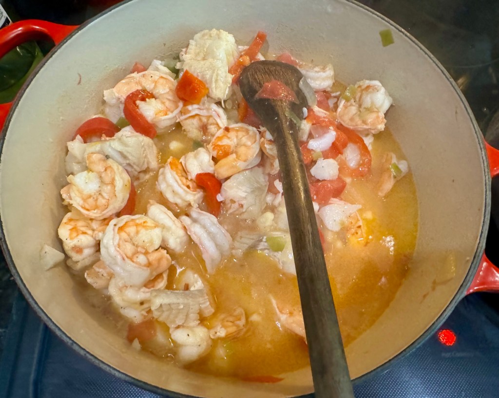 Starting in Asia, I found a delicious-sounding Thai recipe for a seafood stew using shrimp and cod. Something tells me it is labeled a Thai dish because it contains lime and coconut and could resemble the Tom Kha Gai Soup. But the aroma that engulfed the kitchen was unique, and I’m sure it’ll be tasty.
