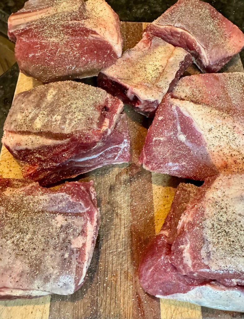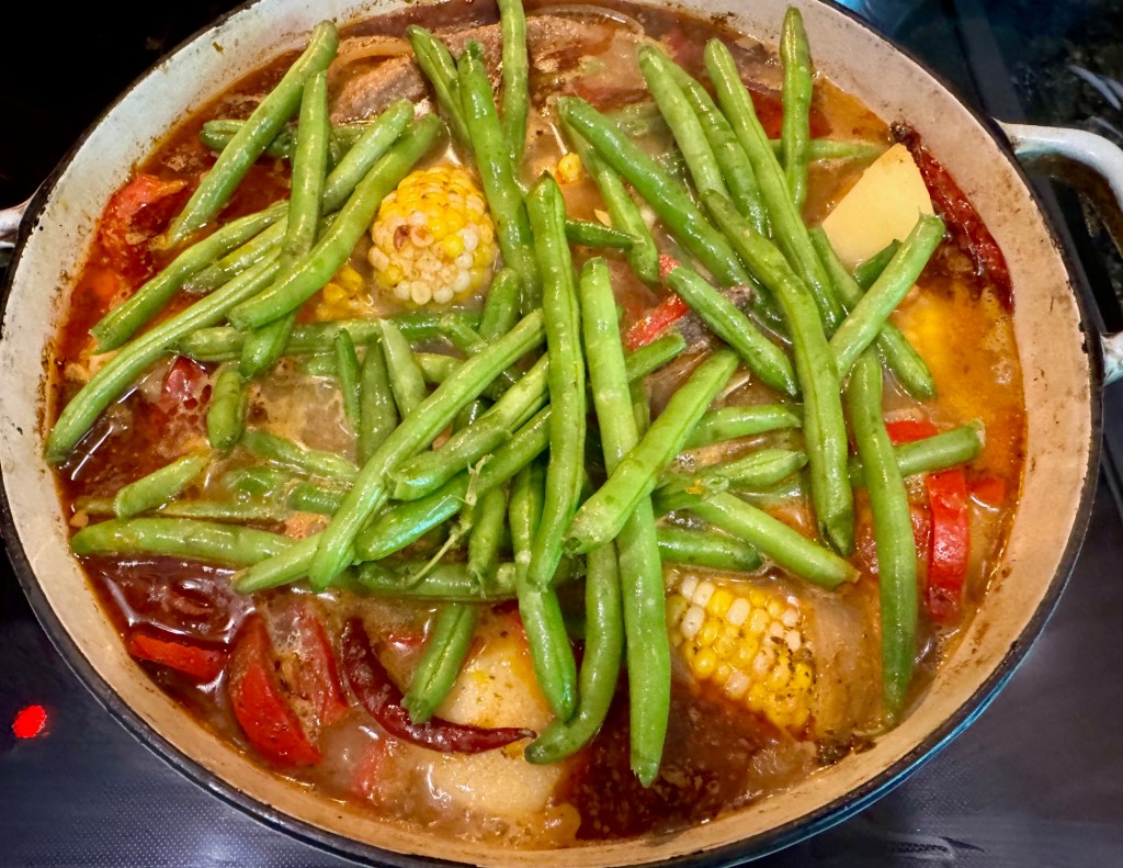 The dish is essentially a beef stew (or soup) using similar ingredients as a traditional beef stew, but the liquid is more soup-like instead of stew. I browned some locally harvested beef short ribs, added vegetables such as onions, carrots, and red potatoes (peeled), and then added the corn.