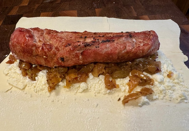 Finally, I made my variation of Beef Wellington but changed the need out with a pork loin. I used parmesan, caramelized onions, homemade apple chutney, and spinach and wrapped it all with a sheet of puff pastry. I call it Pork Svendborg.
