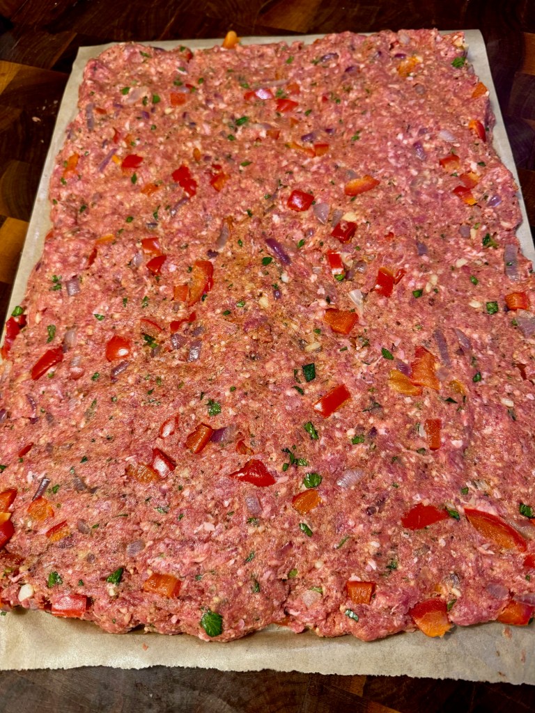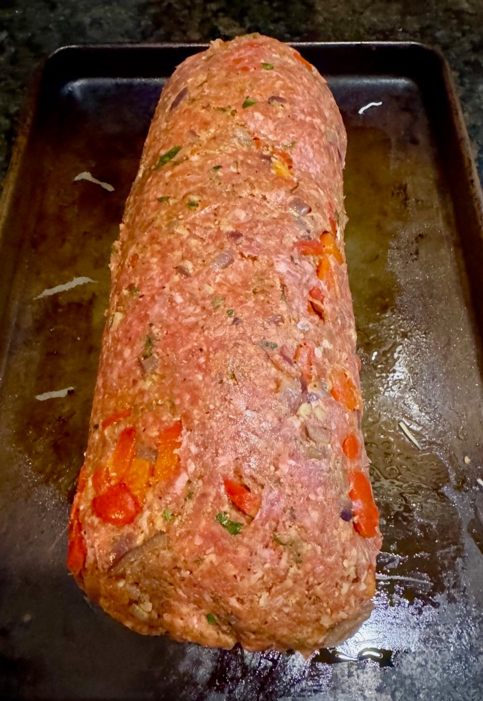 While the soup was simmering, I began mixing and preparing the Sicilian meatloaf. It is simply a large ground beef roulade stuffed with vegetables, slices of ham, and cheese. I roasted it for 45-50 minutes on the Traeger (of course).