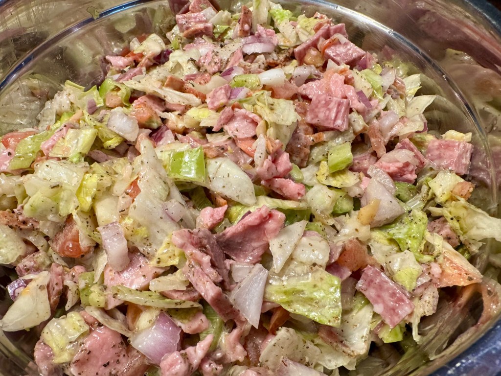 Lastly, I chopped some cold cuts, including my homemade roast beef, lettuce, peppers, and black olives, for an Italian hoagie sub.
