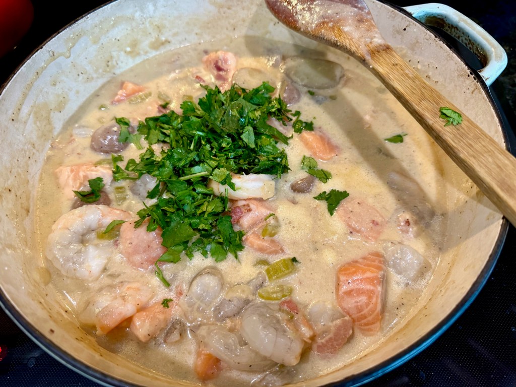 Next, we are enjoying a delicious and creamy seafood chowder with salmon, shrimp, and bacon (of course), served with small potatoes. It has a super-rich flavor and is very filling.