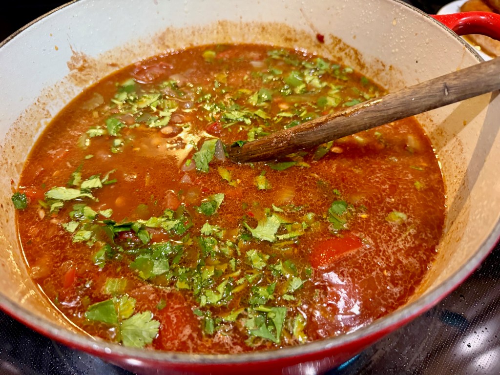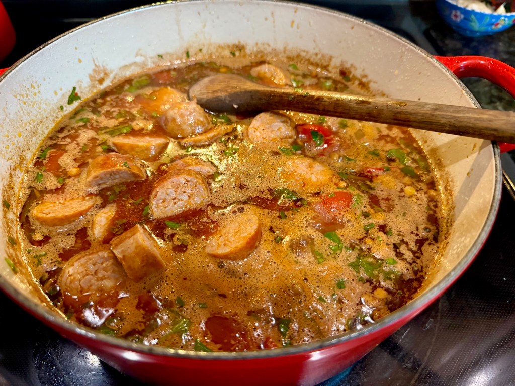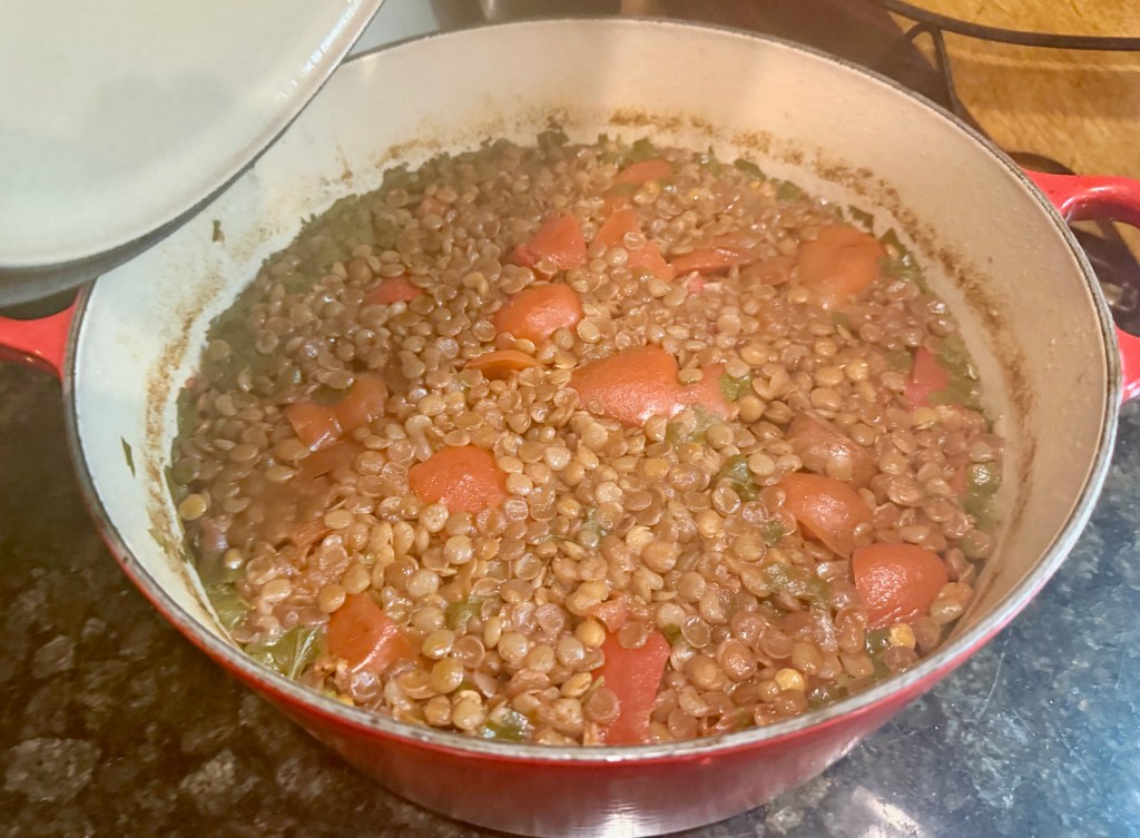 Talking about protein and iron-rich dinners, I made a large portion of lentil soup with hot sausages. I’ve never been a fan of lentil soup as I suffer from lentil PTSD after being force-fed, a strange lentil soup my mother-in-law used to make for us. My version is much tastier, and our kids eat it, too.