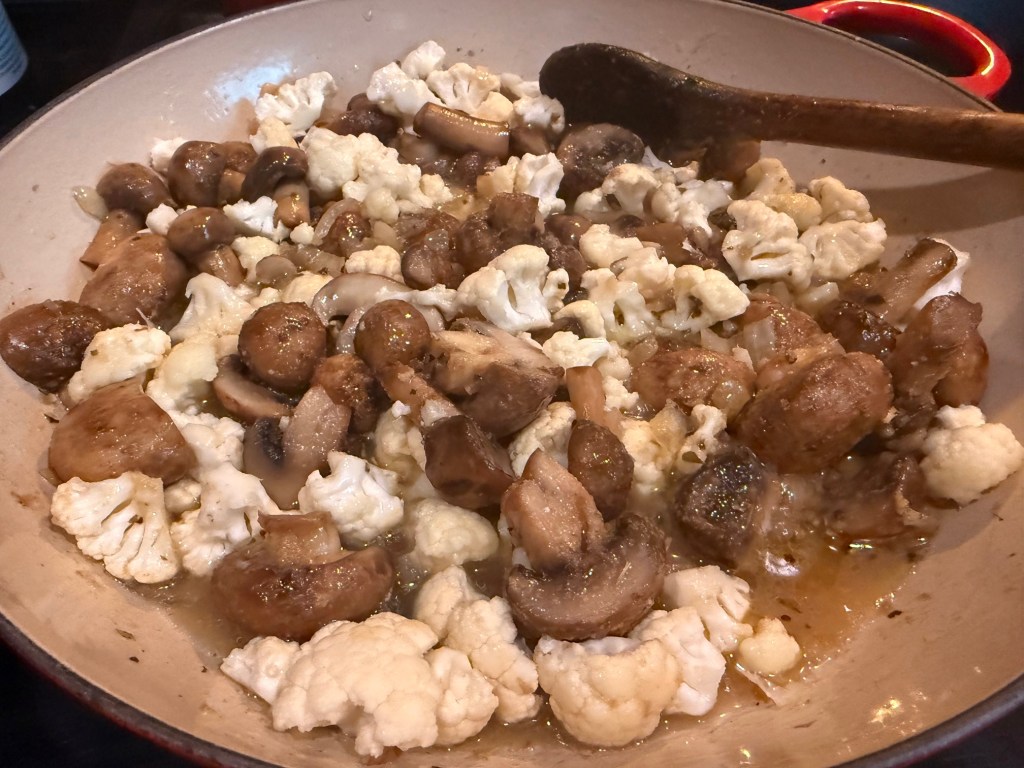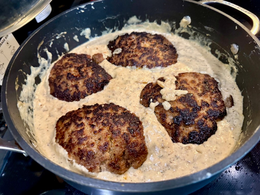 Lastly, but not to be underestimated, I made hamburger steaks in a creamy thyme sauce and will serve it with fried mushrooms and cauliflower.